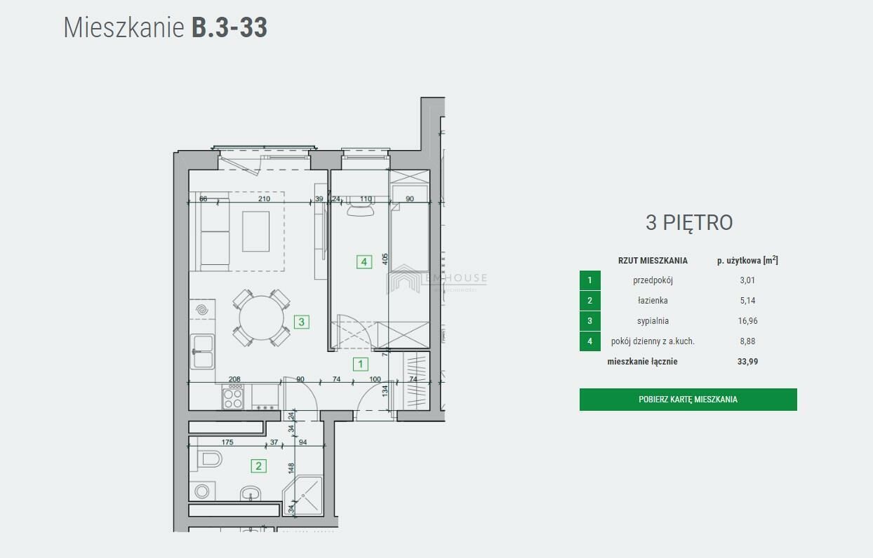 Przedstawiamy Państwu nieruchomość idealną pod zamieszkanie na stałe lub jako atrakcyjną cenowo alternatywę mieszkania nad morzem - zaledwie 12 km do plaży.Mieszkanie 2-pokojowe B-3-33 o powierzchni 33,99 m2 usytuowane na 3 piętrze.